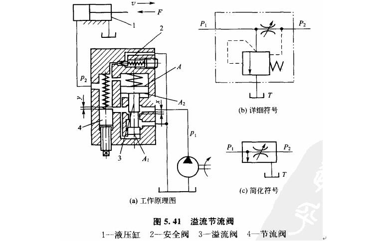 圖5.41為溢流節(jié)流閥的工作原理圖。圖中1是液壓缸.2是安全閥.3是定差溢流閥.4是節(jié)流閥。從液壓泵輸出的壓力油隊,一部分通過節(jié)流閥4的閻口y.由州汕口處流出,壓力降為ρz.進(jìn)入液壓缸1.使活塞克服負(fù)載F以速度U運(yùn)動;另一部分則通過溢流閥3的閥口Z溢回油箱。溢流閥閥芯上端的彈簧腔與節(jié)流閥4的出口(pz)相通,其肩部的油腔和下端的油腔與入口壓力油如相通。在穩(wěn)定工況下,當(dāng)負(fù)載力F增加,即出口壓力pz增大時,溢流閥閥芯上端的壓力增加,閥芯下移,溢流口Z減小,液阻加大,使液壓泵供油壓力P1增加,因而使節(jié)流閥前后的壓差可基本保持不變。當(dāng)pz減少時,溢流閥溢流口x加大,液阻減少,使液壓泵出口隊相應(yīng)減小,同樣使基本保持不變。另外,當(dāng)負(fù)載扣超過安全閥的調(diào)定壓力時,安全閥2將開啟。溢流閥閥芯的受力平衡方程為