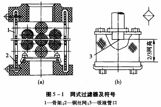(1)網(wǎng)式過(guò)濾器。如圖5 -1所示為網(wǎng)式過(guò)濾器,在塑料或金屬筒形骨架1上包著一層或兩層銅絲網(wǎng)2,過(guò)濾精度由網(wǎng)孔大小和層數(shù)決定。這種過(guò)濾器的特點(diǎn)是:結(jié)構(gòu)簡(jiǎn)單,通流能力大,清洗方便,壓力損失小(一般小于0.025 MPa),缺點(diǎn)是過(guò)濾精度低(一般過(guò)濾精度為0.08 -0.18 mm)。
